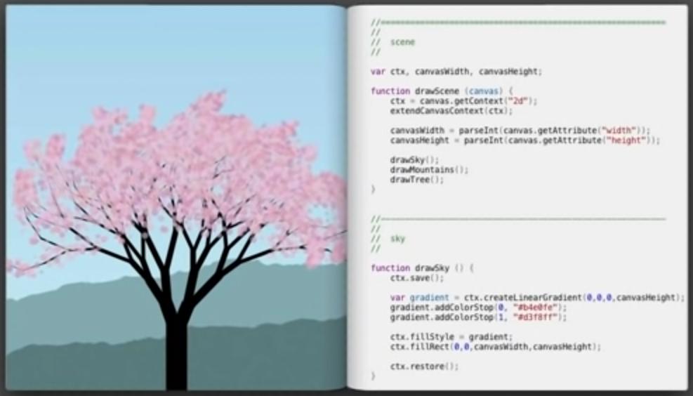 This demo shows off an IDE which has an immediate connection to what is being rendered. Bret demonstrates creating a scene in a JavaScript canvas.